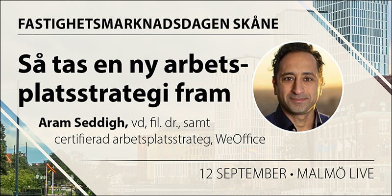 Aram Seddigh kommer hålla föreläsningen ”Så tas en ny arbetsplatsstrategi fram” på Fastighetsmarknadsdagen 2024, Skåne.
