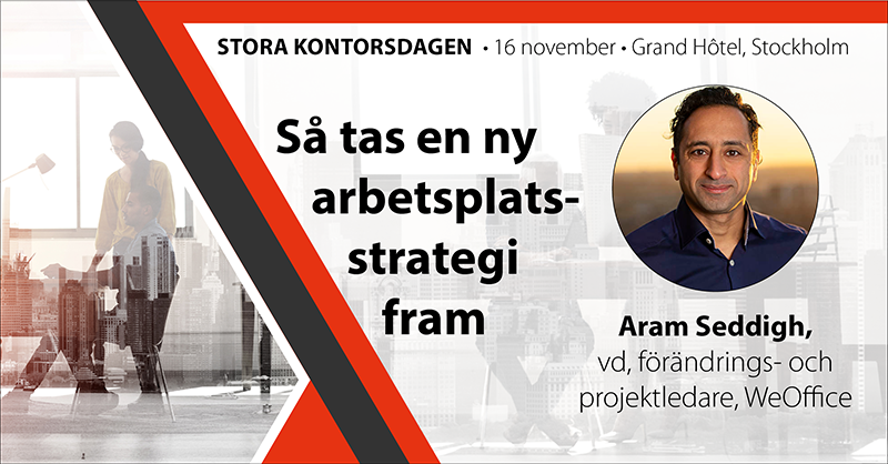Aram Seddigh kommer hålla föreläsningen ”Så tas en ny arbetsplatsstrategi fram” på Stora Kontorsdagen 2023, Stockholm.