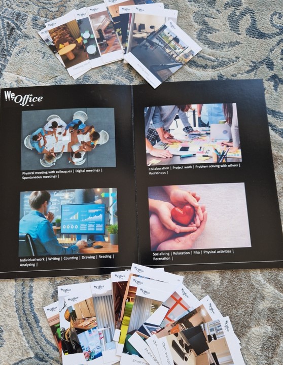 På WeOffice utgörs den fysiska miljöanalysen av workshoppen Min dag på jobbet där medarbetare ombeds uppge sina preferenser gällande arbetsytor. 25 olika ytor presenteras tillsammans med en genomgång av de olika aktiviteter som utförs under en vanlig dag på jobbet. Ytorna besår av olika typer av samarbetsrum, mötesrum, individuella arbetsytor, tysta rum, projektytor osv, och varje workshopdeltagare får möjligheten att ange upp till tre olika ytor som de föredrar mest när det gäller att utföra respektive aktivitet – vare sig det handlar om individuellt arbete, samarbeten, möten eller återhämtning. För att verkligen ge medarbetarna möjlighet att lyfta fram sina preferenser kan samma yta väljas för olika aktiviteter. Resultatet analyseras därefter och ger ett gott underlag till att förstå medarbetarnas preferenser för olika typer av ytor att nyttja för olika typer av aktiviteter.