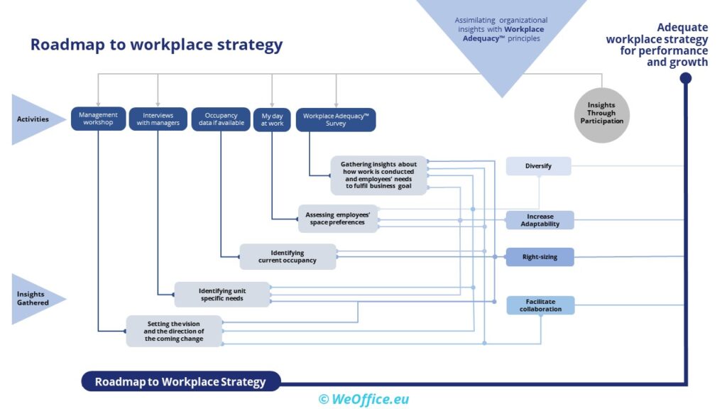 Ramverket Workplace Adequacy™ bygger på 5 evidensbaserade principer, beprövade verktyg (enkäter, workshops-material, dimensioneringsverktyg, och intervjuguider) och en strukturerad metodik för framtagning av arbetsplatsstrategi. Ramverket används för att kartlägga organisationens vision och förutsättningar samt kraven som arbetsuppgifterna ställer på medarbetarna. Metodiken ger en tydlig vägledning i hur nödvändig data för framtagning av arbetsplatsstrategi kan samlas in, tolkas och implementeras.